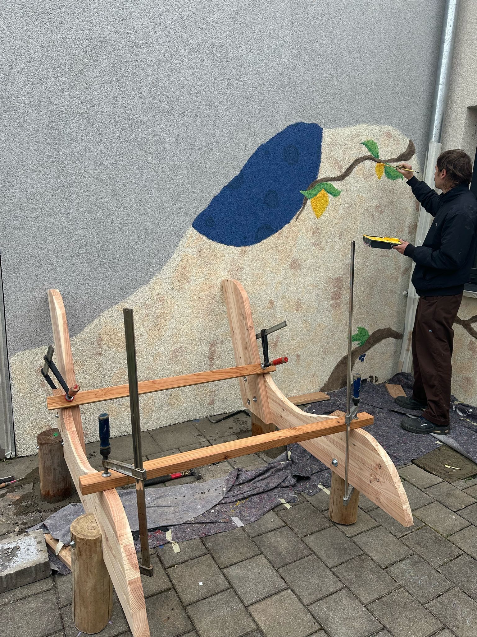 Die Schülerinnen und Schüler der Jahrgangsstufe 9 haben gemeinsam mit den Lehrkräften der Werkstattschule Heidelberg eine Outdoor-Leselounge errichtet. Neben dem Bau von Sitzmöglichkeiten, Liegemöglichkeiten und Tischen wurden die Wände kreativ gestaltet.