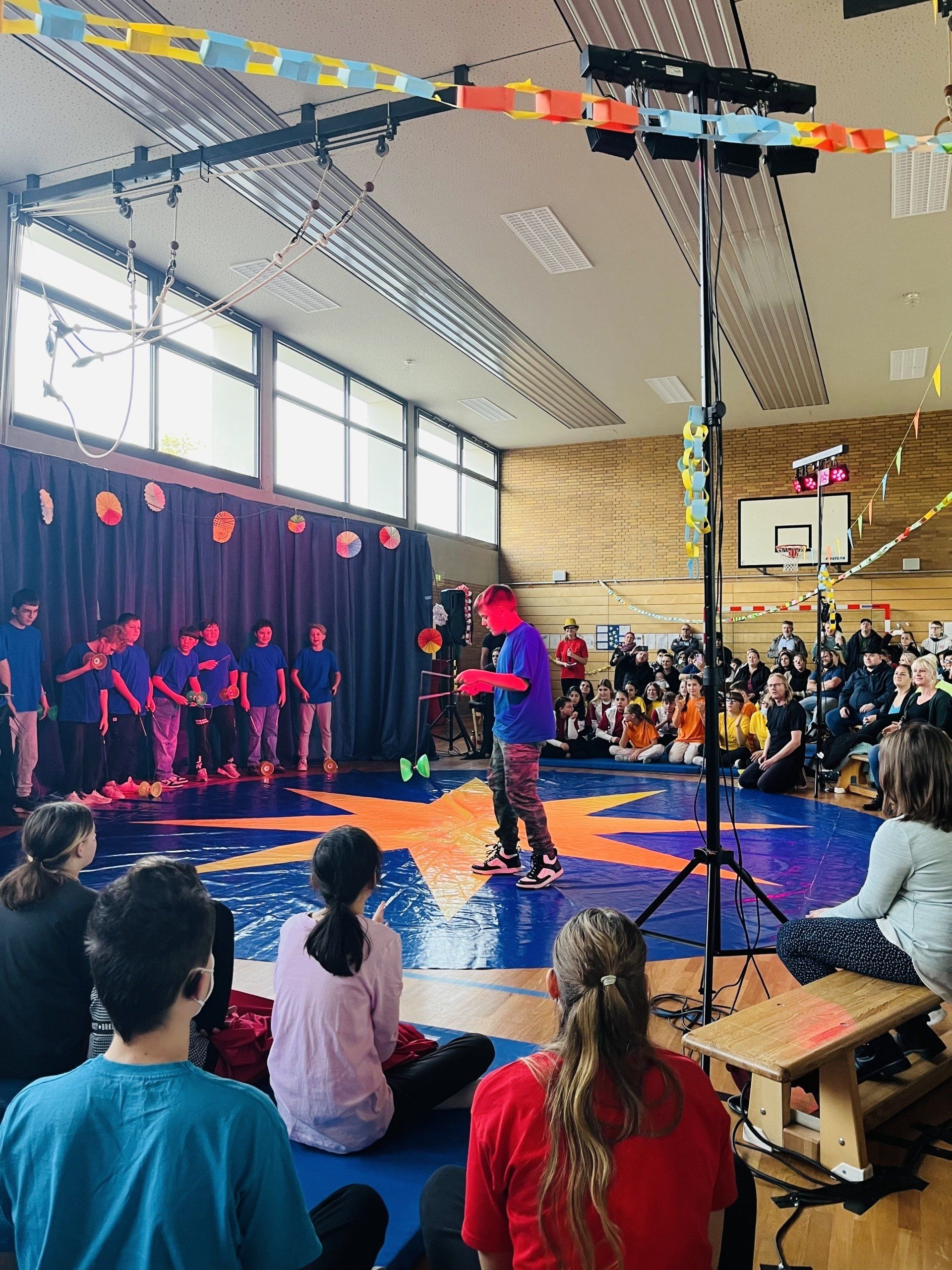 Im Laufe dieser Woche wurden die Schülerinnen und Schüler unserer Jahrgangsstufe 7 zu Artistinnen und Artisten. Die Jugendlichen erlernten zahlreiche Kunststücke und gestalteten die gesamten Hallendekoration selbst.